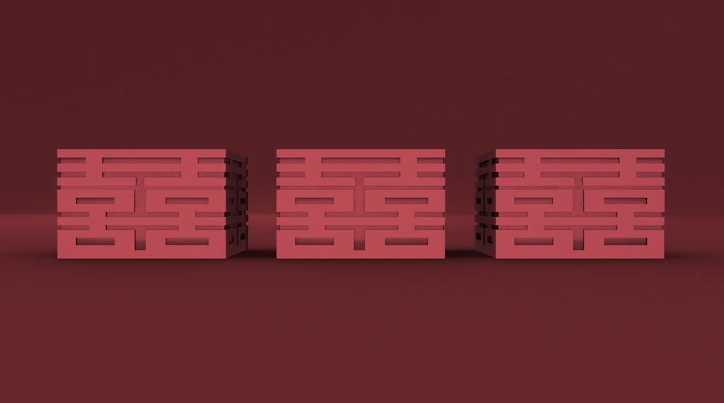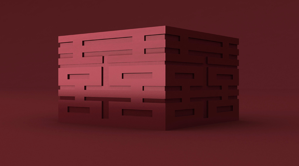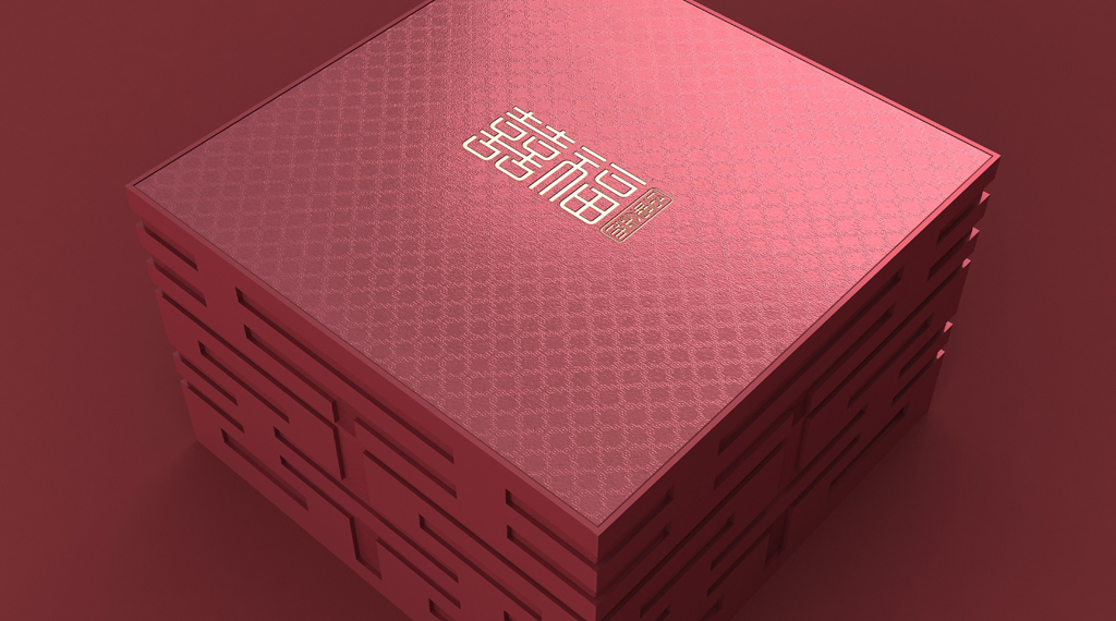 我們發(fā)現(xiàn)“囍”字天生擁有規(guī)則的秩序感,有著可以互相無限連接的特性,隨后將這種連接立體化處理,同時(shí)融入金字塔的結(jié)構(gòu)特征,形成貴重、牢固的、收藏級(jí)的視覺感受。