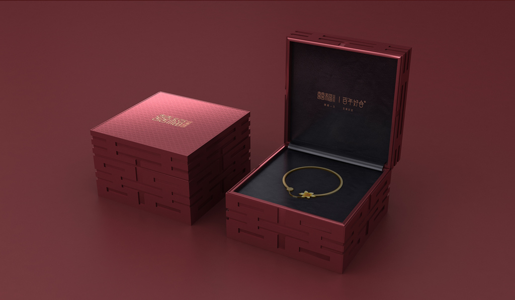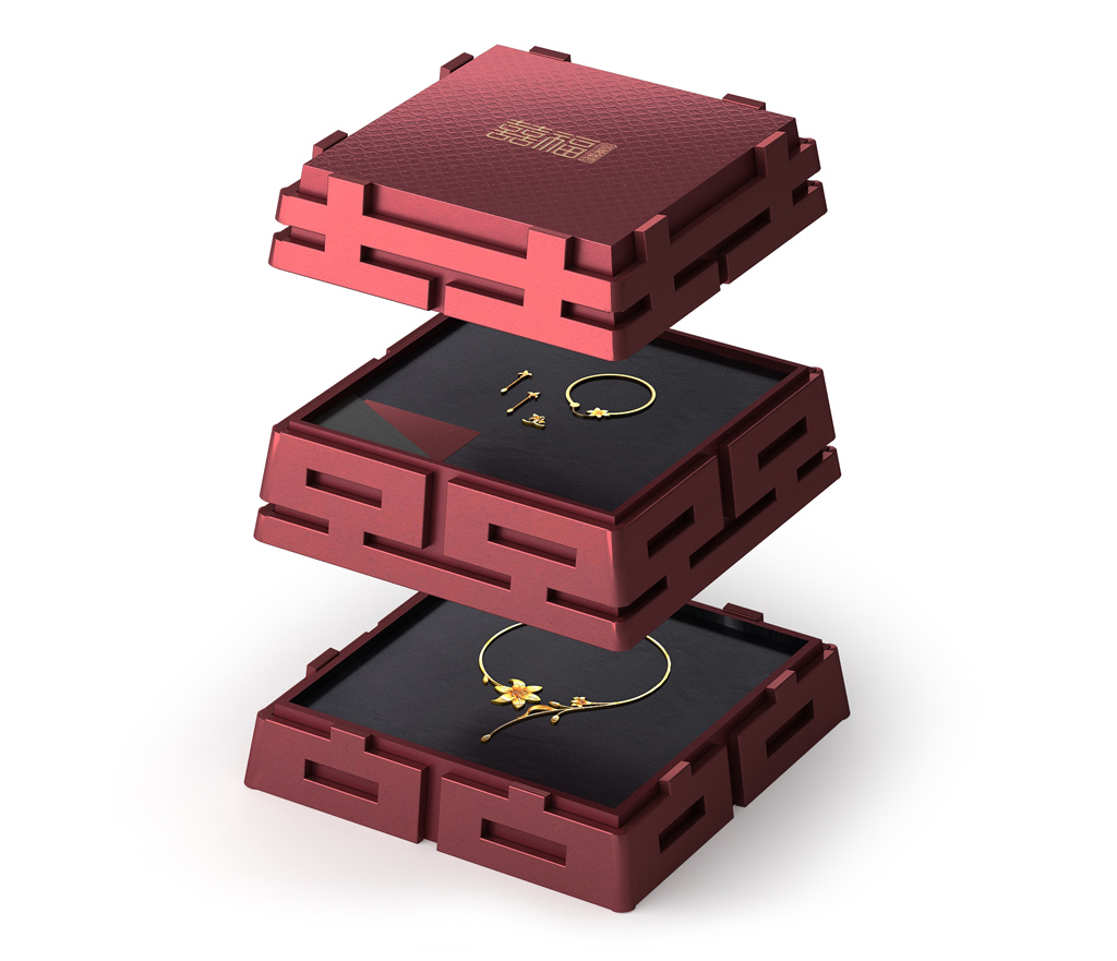 在項(xiàng)目的進(jìn)行過程中,我們提取了傳統(tǒng)結(jié)婚金飾中的喜慶氣氛,拋棄傳統(tǒng)中的千篇一律方盒軟包的外觀形式,從全新的角度思考結(jié)婚金飾的包裝設(shè)計(jì)方法,力求呈現(xiàn)有別于市場(chǎng)上的常見珠寶包裝形式,獲得包裝外觀的新鮮感和獨(dú)特性。