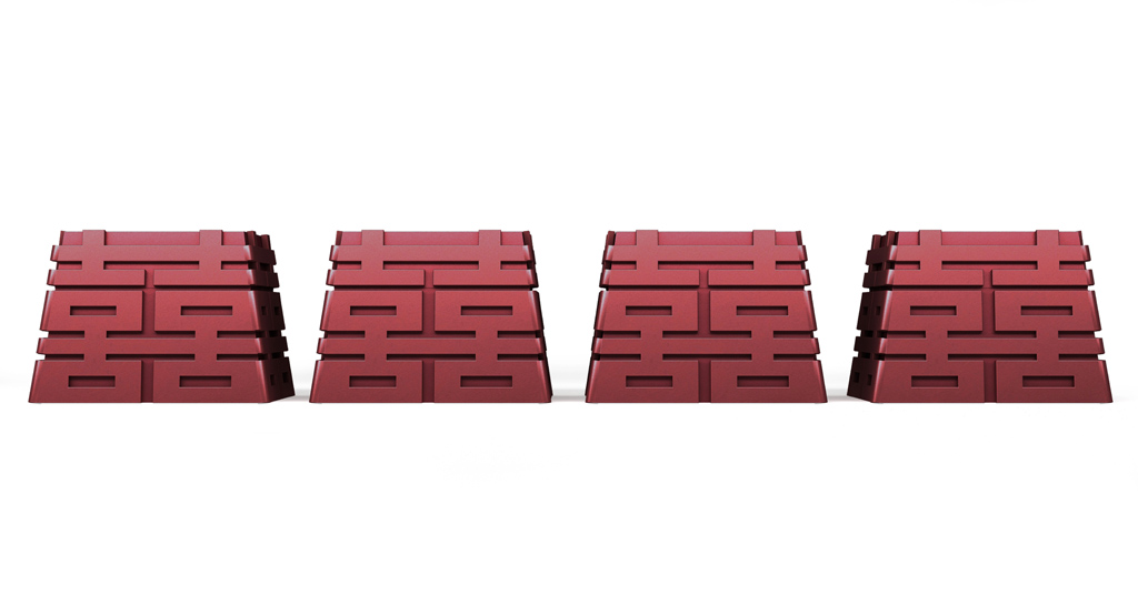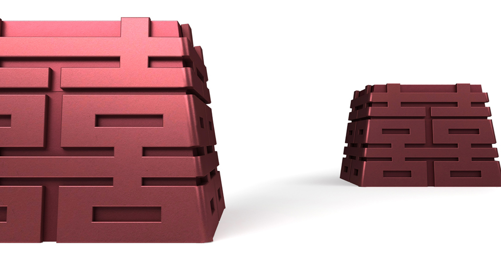 我們發(fā)現(xiàn)“囍”字天生擁有規(guī)則的秩序感,有著可以互相無限連接的特性,隨后將這種連接立體化處理,同時融入金字塔的結構特征,形成貴重、牢固的、收藏級的視覺感受。
